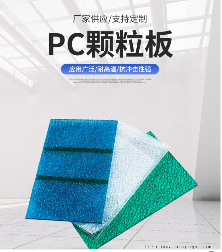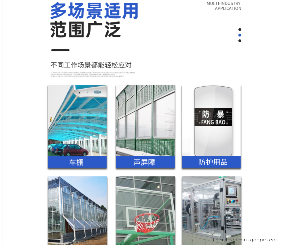 广泛应用于公共建筑、工业厂房、民用建筑的采光或防雨遮阳棚,商业建筑的内外装饰,现代火车站、航空,港口待客厅及通道顶棚,园林,民用温室大棚及室内养殖大咖,园林游艺场所的凉亭,走廊等休息廊亭,路牌广告,灯箱广告及展厅展览布置,高速公路及城市高架路隔音墙,室内隔断或屏风装饰等。